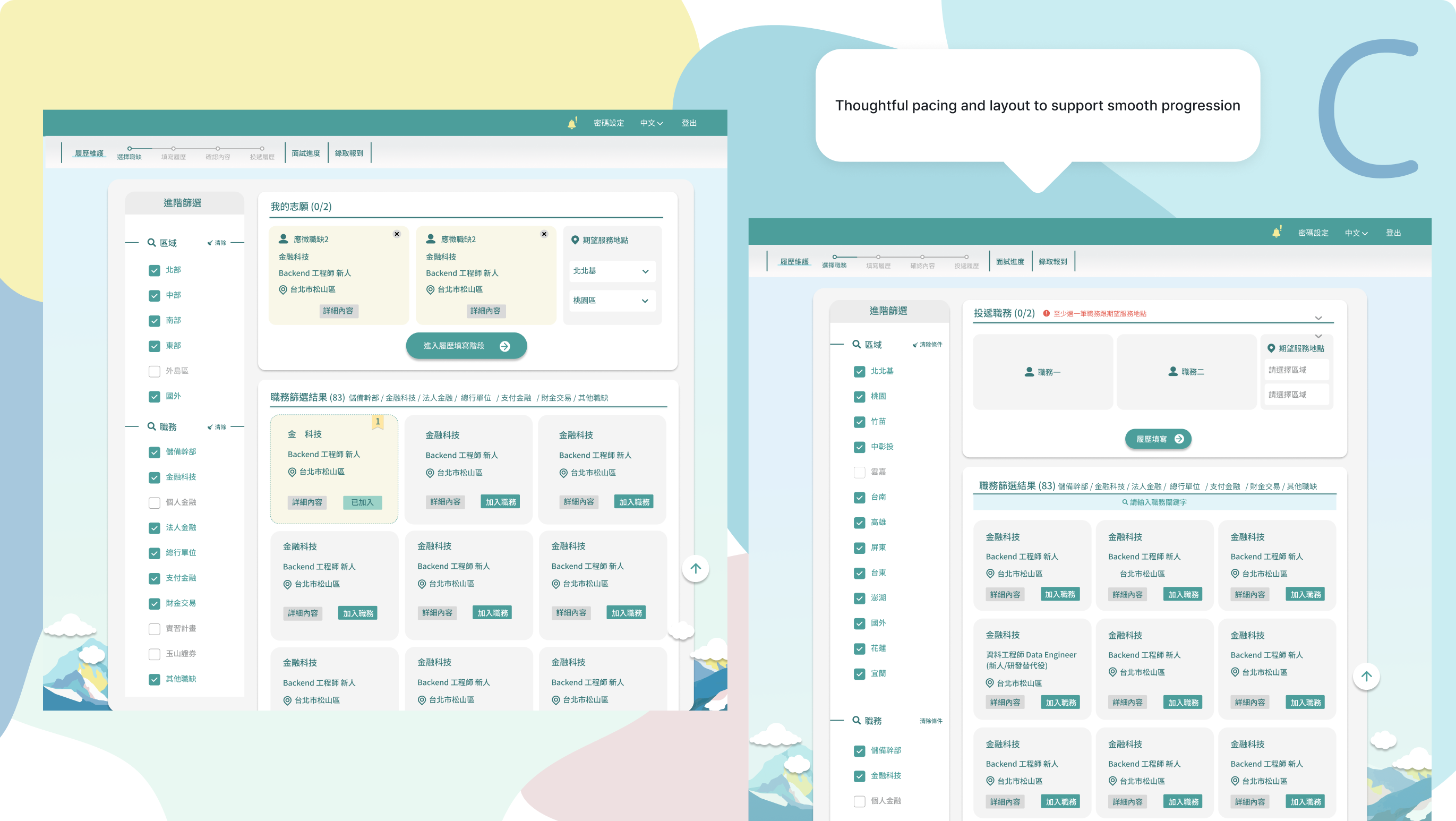 To meet diverse user needs, the webpage offers tailored experiences: first-time users are guided through resume setup and job recommendations to ease entry barriers, while returning users receive personalized job listings and real-time application updates to streamline their actions and boost engagement.